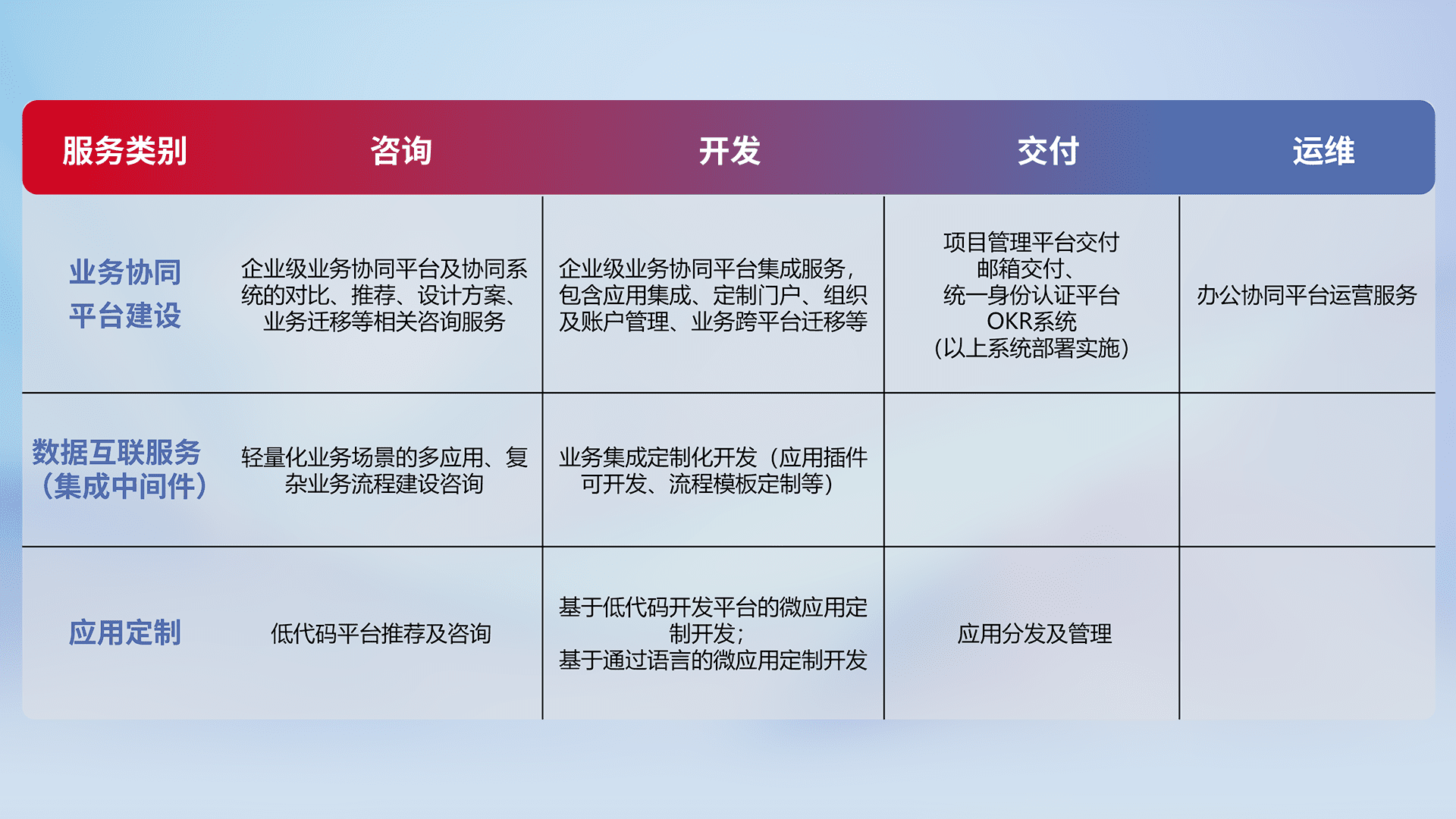 针对钉钉、、企微、、IDaas等平台级产品提供产品的规划、、方案、、、交付、、定制化开发等服务,,实现如统一协同办公、、智能客户服务、、、、混合会议管理、、智能数据查询、、、、等业务场景,,,,实现数字化转型。。。。