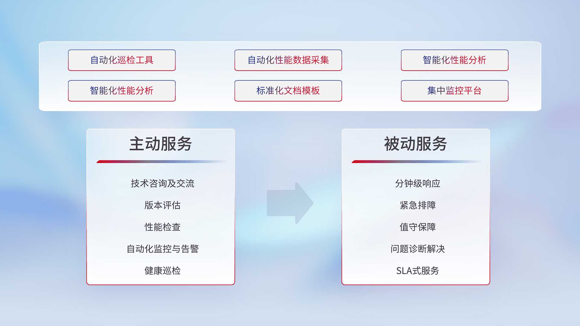 智能化工具和标准化文档,,,,保障服务质量,,提供主动服务(包含技术咨询、、、版本评估、、性能检查、、、自动化监控与告警、、、、健康巡检)和被动服务包含(分钟级响应、、、紧急排障、、值守保障、、问题诊断解决、、SLA服务)。。